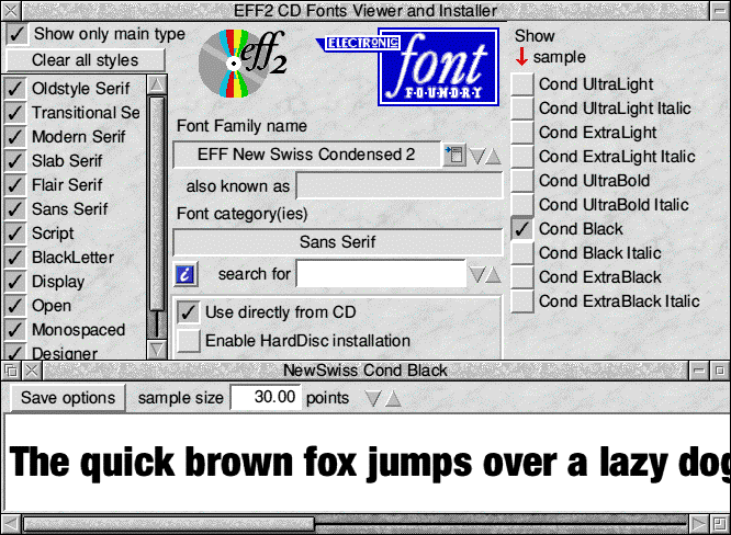 Fontoholics AnonymousAre you addicted to fonts? Geoffrey Dean certainly is, which is why a new CD from the Electronic Font Foundry is likely to make his affliction even worse. ![]() The Electronic Font Foundry is one of the longest-running companies serving the RISC OS platform, and over the ten years or more that it's been producing outline fonts for RISC OS machines, it has built up a vast collection of really top-notch fonts. What's more, because these fonts are created specifically with Acorn's outline font manager in mind, and are much more than just shapes converted from another platform, EFF's collection is unparalleled in quality. Although EFF is not the only producer of professional-quality fonts in the RISC OS market, it's by far the most well-established and there's no denying that, in technical terms, its fonts are simply the best you can buy. EFF Professional TypographySo it came as a bit of a surprise in 1997 when EFF launched its first Professional Typography CD-ROM. Although EFF's professional-quality fonts could hardly be accused of being expensive (just compare them with the technically inferior equivalents on other platforms, which cost many times the price), it was still selling them individually for a few pounds each. So, the appearance of a CD containing 500 of these outstanding fonts for the normal price of only a handful of them was extremely exciting for fontoholics like me. ...The Sequel!That CD was actually christened EFF 1, which led me to hope that there would eventually be a volume 2. Now, around two years on, EFF has indeed released a second volume, and what a pleasure it is to see it! Although it's still far from representing EFF's entire font catalogue, the new CD contains no fewer than 800 fonts (in fact, there are actually 805 faces). The first thing to realise is that if you've got the original EFF disc, you won't need it any more; every single font that was on volume 1 is still present on volume 2. If you do have the first CD, you are entitled to upgrade to this new version for half price, so there's no reason to feel cheesed off about duplicated contents. The great thing is that, as well as numerous new font families which haven't been on CD before, the new disc adds extra weights to families from volume 1, so if you've got the first disc you'll find that many of the fonts you already know and love have suddenly become a whole lot more useful. RISC OS and moreSo, even if you've already bought volume 1, volume 2 gives you an extra 300 RISC OS fonts on top of the original 500. Great! But it's actually better than that: the new volume 2 disc is dual-platform. It supports both RISC OS and Windows. EFF itself also sells Mac-format fonts, so maybe if there's ever a third CD, it might support the Mac too. But since a lot of RISC OS users also have PCs, this is great news; as well as the 800+ RISC OS fonts that you now own, exactly equivalent fonts can be used under Windows, which makes it a lot easier to create a consistent appearance between work done on different platforms. If you upgrade from the first disc, therefore, you'll find yourself in possession of PC equivalents of most of your best existing RISC OS fonts in addition to all the new ones. What do you get?The CD is attractively presented and comes in a jewel case with a booklet that lists all 800 fonts, fifty per page (all the references are in the fonts themselves, of course, so you can see what each one looks like). The booklet actually says '800+5' fonts, because there are five extra symbolic fonts in addition to the alphanumeric range. In fact there are only four, but EFF Mackintosh (a tribute to Charles Rennie Mackintosh) is a pair of faces comprising a highy decorative alphanumeric face and a set of ornaments. So, what do you actually get on the disc? Well, opening the root directory reveals a set of files for Windows users and directories of PostScript and TrueType fonts for the PC, plus a RISC OS directory. There is also multi-platform documentation in the form of illustrated HTML files, which give installation instructions for both platforms along with a bit of information about EFF and its products. RISC OS users actually get a bit more than Windows users, as the RISC OS directory contains a couple of applications as well as the fonts. One application is EFF's 2000 catalogue; the other is a special version of the catalogue which lists the contents of the CD and allows you to install selections of fonts to your hard disc. It's actually possible to use the fonts directly from the CD, though performance will clearly be better if you copy them to your hard disc first. Such a wide range of fonts makes a font manager application such as LOOKsystems' Font Directory Pro a particular asset, of course. ![]() Both catalogues allow you to view font samples (including fonts not on the CD in the case of the full catalogue), and indeed the full catalogue indicates exactly which faces are included on the CD by means of a tick or cross. That obviously helps you to know if there are more faces in a family than the ones you own. For both catalogues, although you can view all fonts in one huge list if you want, they can also be viewed by category by turning on switches for 'Transitional serif', 'Script', 'Open' fonts and so on, which makes it very easy to find the kind of font you're looking for quickly. These programs are therefore pretty well thought out. What of the fonts themselves? Well, ignoring the PostScript and TrueType fonts for Windows, the RISC OS fonts are actually in EFF's 'Publisher' format. That means that you get the full RISC OS font plus an equivalent PostScript Type I version of each face for downloading to PostScript printers and imagesetters. As this represents the most comprehensive and expensive of EFF's font formats, there's no complaining about value. Note that all the RISC OS fonts are in RISC OS 3 format, and include auto-kerning data. This means that they won't work on RISC OS 2