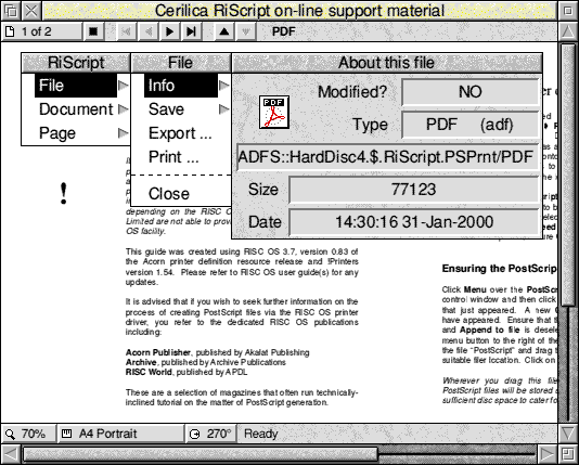 RiScript is a very easy application to use, and the manual makes an excellent job of explaining the different types of files that RiScript can handle. The manual also contains a very good explanation of PostScript, PDF and EPS (Encapsulated PostScript) files. Along the top of the RiScript window are simple and easy to use controls that can be used to move through the pages in multiple page documents. Along the bottom of the window are buttons to set the size of the screen display, the paper size & the angle the document will be displayed (in 90 degree steps). Once you have your document in RiScript there are a number of things you can do with it. Firstly you can view it, very useful if you are checking a file before sending it to someone. Secondly you can print it, again very useful if documentation has been supplied in PDF format. Thirdly you can convert the file to something else; for example, you can load a PostScript file created using the Acorn printer drivers and export it as a PDF file.