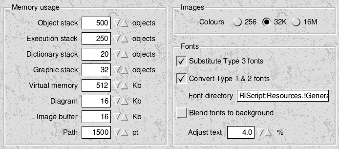 GhostScript 5.50GhostScript is another freely available package, supplied under the Alladin Free Public licence, which basically means that you can distribute the package, provided you do not charge for it, and that as a single non-business user you do not have to pay for it. GhostScript started out as a Unix/Linux package, and is command-line driven. You don't get any nice WIMP based front end, so if you want to actually make it do anything you have to wade through the documentation and then write Obey files to make the thing work. For example the Obey file shown below will convert the named PostScript file to a PDF file. WimpSlot -Min 10000K -Max 10000K ps2pdf ADFS::HardDisc4.$.Printout ADFS::HardDisc4.$.GhostScrip.PDF/PDF As you can see this is not user-friendly. However, if you can get to grips with GhostScript, and you have enough memory (I recommend at least 32MB) then you have a powerful package that can preview PostScript files on screen using the optional GhostView application, can convert files into a number of other formats, and can generate very compact and well-defined PDF files using some of the most modern techniques. As a free package GhostScript is superb, if you are prepared to spend the time getting it to operate. If you are not, and you would like a proper front end that makes sense, then you will need a decent well-supported commercial package, such as RiScript PRO. RiScript ProRiScript Pro is supplied on two floppy disks, with a 64-page printed ring-bound manual. Installation is simply a matter of dragging the application from the archive on disk one to your hard disk. Disk two contains sample files and other resources. One small problem then appeared, RiScript Pro requires the nested window manager, and the machine I was using didn't have it installed. To be fair to Cerilica it does say on the front of the package that the latest !Boot upgrade, or RISC OS 4 is required, but it might be nice for the warning to be re-worded to make it more obvious. Running the package is just a matter of double clicking, if you then want to view a file such as a PostScript document, simply double click on it and it will appear in the RiScript window.