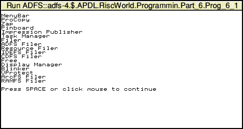 Put a copy of the last program we wrote (named Prog_6_3 on the CD) in the !Prog directory and change its name to 'Program'. Now we want to tell the TaskWindow to run this program. The problem is, where is it? We 'know' it's in the !Prog directory, but that could be anywhere, on any type of drive. Luckily there's an easy way.