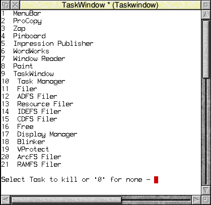 What this should produce is the same list of Tasks as before, but with a number, starting from 1, beside each. This should give you a clue as to where we are going next. The idea is to enable you to kill any one of the listed Tasks by entering the number. However, before we can do this we have to add code to make the selection, which is nothing new, we've done that before, but there are two other essential things that are new.