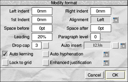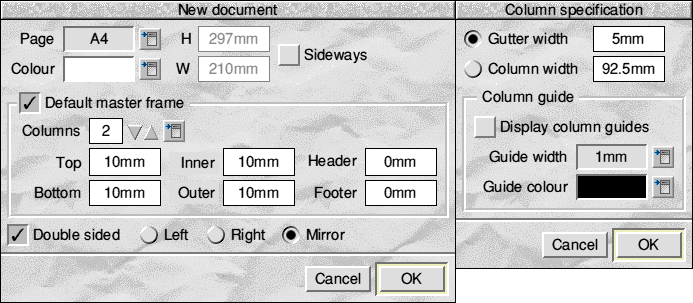 The list above is, of course, just a taster of the more important features that the package offers. In fact, the range of facilities it provides is so extensive that it would be totally impractical to try to describe them all in a review such as this, so I'll just run through the more important aspects of what it can do. I ought perhaps to say from the outset that Ovation Pro is definitely one of my favourite RISC OS applications. Having used it constantly since 1996 to produce documents ranging from simple black and white posters to full-colour magazines, I've obviously had a lot of experience with it; and yet, even now, there are plenty of features that I've never needed to use at all! That isn't to say that it's Windows-style bloatware; it's just an extremely comprehensive piece of software. I'm also quite experienced in the use of Impression, QuarkXPress and Adobe InDesign, and I can say with certainty that Ovation Pro is easily my favourite of all of these. So, let's run through some of the basics of what the package can do. If you're reading this because you don't have Ovation Pro already, then the chances are that you'll be a user of Impression. I'll therefore compare Ovation Pro with Impression from time to time in what follows. ![]() Creating documents and master pagesThe first thing to do, when creating a document from scratch, is to define some page characteristics on which your layout will be based. Unlike Impression, Ovation Pro does not have a range of pre-defined master pages already available; instead, you just define the basic features of the page before you start, and from then on you will have one master page per chapter of your document. You can edit the master pages individually at any time, and changes will be reflected in your document.The absence of presets is really no loss. In a sense, Impression's provision of multiple master pages (with facing pages, two-column layouts and so on) was partly to overcome the fact that such layouts were not terribly easy to set up within the program. Ovation Pro has the distinct advantage of supporting multi-column text frames, so master pages with multiple column frames pre-defined are simply not necessary. All these facilities are just options that you can choose when defining the basic characteristics of your document. So, when creating a new document in Ovation Pro, you define the size and format of your page (upright or sideways), choose whether it's double-sided (and if so, whether to define a left, right or mirrored layout), and specify how many columns the frames will have. You can of course set the size of the margins around the frame, and even say whether there should be separate header and footer areas in the master frame. One you've defined your master page in this way, it's very easy to add further elements such as graphics, page numbers or whatever. The only real shortcoming with Ovation Pro's approach is that the master page for every chapter will be individual, so if you create a multi-chapter document (with all chapters based on identical master pages) and subsequently decide to modify an aspect of the master page layout, you'll have to edit them all individually, which could be a nuisance for larger jobs. In Impression you'd only have to edit a single, named master page for the changes to be reflected in all chapters based on it. So, Ovation Pro does drop a few Brownie points here, but in reality it's not likely to be a major concern for most users. Of course, you're not obliged to fiddle around with master pages every time you create a new document. If all you want is a standard A4 page then just clicking on the icon on the icon bar will open one up. There's also a handy stationery facility (provided by an extension applet) that allows you to store commonly-used document templates in a submenu off the icon bar menu. Text handlingUsers of other computer platforms still generally think of DTP packages more as layout programs than as word processors, but the term 'document processor', first conjured up to describe Impression, is at least as applicable to Ovation Pro. Powerful DTP package it may be, but it's more than suitable for use as a straightforward word processor as well.As you would expect, Ovation Pro provides a full and comprehensive named text style system, along with equivalent local effects for occasions when defining a style is overkill. The scope of any individual style can be set to apply to a selection, word, line, paragraph or story. Styles can be named freely and reordered in the list, which is useful if you want to group related styles together. The number of attributes that any style can define is very wide, and ranges from the obvious, expected options like Bold, Italic and Superscript to more obscure ones such as Rotate and Skew (occasionally useful for printing slanted text at an angle, for instance). The style can also set the case of the letters (normal, all caps or every word capitalised), and you can make unexpectedly detailed settings for things like Underline and Strikeout (e.g. single or double lines, word- or continuous-underlining styles, together with colour and rule thickness). Styles can be used to insert drop caps, bullets or numbers at the starts of paragraphs, and there are particularly comprehensive controls for hyphenation and enhanced justification (the latter controlling the use of word- and letter-spacing). Styles also encompass the use of rulers (there is no distinction between rulers and text styles). ![]() A particularly welcome feature of Ovation Pro (at least, for users of Impression) is that the set of definable options within a text style exactly matches the range of local text effects that the program provides. A great annoyance with Impression, for me at least, was that only a few of the possible style options were available for use as local effects, which often meant that you had to define a new style for a one-off application of a trivial spacing modification, 