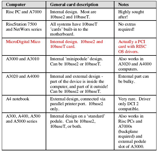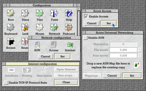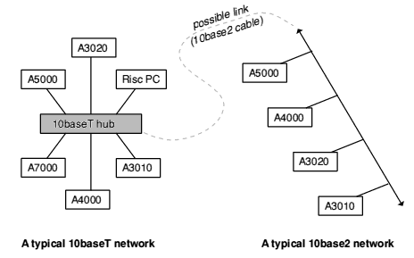 Networking - Part 1, HardwareRichard Walker introduces a new networking column In this series, I hope to explain some of the mysteries of networking. We will start from the absolute basics: cabling and simple file and printer sharing between RISC OS computers. Then we will work up to more complex scenarios, such as cross-platform communication and shared Internet access. We shall also explore cheaper alternatives to the popular Ethernet network system, such as a serial link. Ethernet cablingThe most basic requirement for an Ethernet network between some RISC OS computers is a pair of Ethernet interface cards (and some Ethernet cable!). There are a number of different types of interface card available, depending on which RISC OS computers you have. In addition, there are two basic types of Ethernet cabling in common use today. You must use the correct cable for your Ethernet cards: some cards support both types, but many support only one. The two Ethernet cable types are 10base2 and 10baseT. The former, 10base2, is co-axial cable in a bus configuration (one end-to-end run of cable joining all the computers). The cable run can be no longer than 185m in total, computers must be at least 0.6m apart, and a 50ohm terminator has to be fitted to each end of the cable run. 10baseT is twisted pair cable in a star configuration (one cable for each computer, all going to a central point). Each 10baseT cable from the central point (or, more correctly, the 'hub') can be a maximum of 100m in length. Both types of Ethernet cable operate at the same speed: a maximum of 10 megabits per second (or 10/8 = 1.25 megabytes per second). Your choice of cable type will mainly depend on what your Ethernet interface card supports. If you have two cards with a 10base2 port, it is simpler to use 10base2 cable to join them together. If you have a mixture of card types, don't worry - you can usually connect a single 10base2 run to a 10baseT hub. Illustrations are shown below: ![]() As you might guess, another important factor is the physical layout of the computers, and the distance(s) between them. 10base2 is often physically easier. However, there is a significant drawback with 10base2: one unplugged cable or, more seriously, a break in the main cable will stop the whole network working! In a typical home setup, this might not be a problem, but consider the implications in a busy classroom or office! Note that you can join two computers together with 10baseT without the use of a hub - just use a special 'cross-over' cable, and you don't need to spend money on a hub (unless you later want to add a third computer). The final point to consider is that the cable usually used for 10baseT, 'category 5', is capable of running at 100 megabits per second (12.5 megabytes per second) which is 100baseT. Although all the current Ethernet cards for RISC OS machines can only work to 10 megabits per second, dual-standard 10/100baseT cards are commonplace in PCs and Macs, and Omega will allegedly support 100baseT. If you are interested in 100baseT (for now or the future) it would be wise to ensure you buy a suitable hub, unless you don't mind throwing it away and replacing it with a 100baseT one at some point in the future. You can mix 100baseT and 10baseT if you buy a 'switchable' hub, or join together a 10baseT and 100baseT hub with a switch. Such an arrangement allows you to connect current RISC OS machines to a 100baseT network. Expect to pay a few pounds for 10baseT or 10base2 cable and the 10base2 terminators. A 10baseT hub can cost from £25 for a basic 4-port 10baseT model, to £40 for a 8-port 10baseT with a 10base2 port, or £50 for similar models with 100baseT capability (instead of 10baseT). Ethernet interface cardsThe more complicated and expensive side of the story is network cards. In the high-volume PC land, new 10/100baseT cards can be picked up for £10. Sadly, this is not the case in the RISC OS marketplace. A brand new 10base2/10baseT (both types supported) will cost the best part of £100! There are also many different card types, for all the different RISC OS computers out there. ![]() Currently the Microdigital Mico has no network sockets. MicroDigital have said that a network card will be produced in the future. The most cost effective option for acquiring an Ethernet network card is to find one second hand. They occasionally pop up in the comp.sys.acorn newsgroups, and you may find a local school casually throwing them in a skip (along with the computer!). Some RISC OS dealers, such as CJE Micros, try to sell second-hand cards when they come across them. If anyone is feeling put off by the expense of all this, please do bear with me. A future article will look at how you can achieve most of the Ethernet functionality between two computers, for a fraction of the cost - with a serial link. RISC OS setupFirst off, you must be running RISC OS 3.1 or later. You cannot use RISC OS 2! For basic file and printer sharing, we will use Acorn Access (the ShareFS and Freeway modules), which is supplied with RISC OS 3.6 or later. For the benefit of RISC OS 3.1 and 3.5 users these modules tends to be supplied on the ROM/EPROM/flashROM on the Ethernet card, so they appear to be part of the OS. RISC OS 3.6 and later (although 3.6 soft-loads it from disc) and some Ethernet cards supply Access+, which is basically a slightly enhanced version of ShareFS supporting basic usernames and passwords, this adds a degree of security to the file sharing. I would strongly advise RISC OS 3.5 and 3.6 users that, to take advantage of the enhanced (yet simple!) configuration tools, you upgrade your boot sequence to the 'Acorn Universal Boot', which can be found here: http://acorn.riscos.com/riscos/releases/UniBoot/ RISC OS 3.7 and 4 users should note that the network configuration tools built in to Boot/Configure are very similar. RISC OS 3.1 users have a bit of a dilemma. You can also use the 'Acorn Universal Boot', but it runs like a blocke