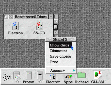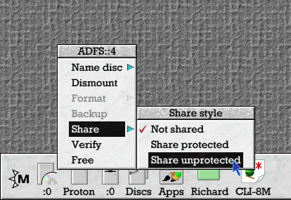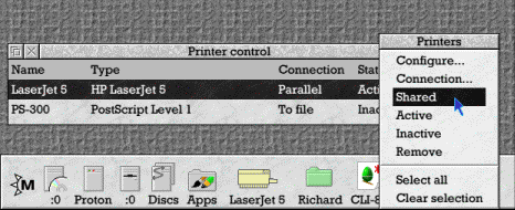 ![]() Using Boot/Configure to enable only Access Please note that getting Access to work in harmony with TCP/IP and/or AUN will be covered in a later article. For now, it's one or the other. You can always re-enable TCP/IP later on if you need to (although it will stop Access working). Using Access to share filesOn one of the computers, press MENU over the hard disc icon bar icon, slide off 'Share' and choose 'Share unprotected'. Move to the other computer and click on the 'Discs' icon bar icon. You should see a Filer window containing a single hard disc icon with the same name as the hard disc you just shared. Double-click this icon, and the Discs icon bar icon should change to show the name of your shared hard disc. Clicking SELECT on this icon should display the contents in a Filer window, and you can manipulate the files as if they were local. ![]() Sharing a whole hard disc in unprotected mode ![]() Available shared discs (single disc, no active mounts) ![]() Available shared discs (multiple discs, one active mount) This is a very basic demonstration of Access file sharing. Now try the procedure the other way around - you can then see both hard discs from either computer! When you have finished using a shared disc, simply press MENU over the shared disc icon and click 'Dismount'. Experiment with opening multiple shares on one computer and see how you get extra icons (e.g. share the hard disc and CD ROM drive of one computer, and open them on the other one). If you want your computer to remember which shared discs you are connected to next time you re-boot, press MENU over the 'Discs' icon (or share icon) and click 'Save choice'. To get more fancy file sharing, you can experiment with the 'share protected' option. This will share files, obeying the file's access rights (with the Filer, press MENU over a file, and look at them). This kind of sharing is useful with, say, a cluster of discless machines where you want to share a common boot sequence and applications repository. To understand how the access rights work, make some copies of files and experiment - set them up with different rights and see how/if they appear on other computers. Note that if you are changing the access rights on files, the Filer window on the other computer(s) can forget to update - you may need to re-open the window, or even dismount and re-mount the share again. More interesting effects can be obtained with the ShareFS *commands (press CTRL-F12 and type 'Help ShareFS'). You need to use these to share only certain subdirectories (as opposed to whole discs) unless you are using RISC OS 4+ (as part of the Select scheme) which provides a Filer option for doing this. Two additional applications are supplied in $.Utilities.Access+ with RISC OS 3.6 and later: Access+ and AccessCD. The Access+ application provides a simple way of setting up usernames and passwords for shares. Run Access+, and drag a directory onto it's icon bar icon. Enter a password for the new share (strictly, this is optional) and click 'OK'. You can recall this information by using the 'Show' option from the Access+ icon bar icon. Similarly, you can delete the share with the 'Remove' option. To make Access+ remember your new settings, use the 'Save' option. ![]() Setting up a password-protected Access+ file share From a client computer, press MENU on the 'Discs' icon, slide off 'Access+' and 'Logon'. Enter the sharename and password you setup earlier and press ENTER. Note that, irritatingly, you cannot press TAB to move from the share name field to the password field - it's ENTER or CURSOR-DOWN. You should see the share you defined. To dismount, again slide off the 'Access+' submenu, but then slide off 'Logoff' and click on the name of the share you wish to dismount. ![]() Logging on to a password-protected Access+ file share The Access+ application has reasonably extensive help available. In a Filer window, press MENU over the application, slide off 'App. '!Access+'' and click 'Help'. AccessCD provides a RAM cache to help speed-up multiple access to CD ROMs over a network. To use it, simply double-click it, and set the amount of memory (in kilobytes) you wish to reserve for the cache. Now, all CD ROM shares from that computer will use the cache. If you frequently want to share CD ROMs, it would be a good idea to have AccessCD automatically run at boot-up. Note that AccessCD only needs to be run on the computer which is actually sharing the CD ROM drive! Using Access to share printersAs with file sharing, this is also very simple. On the computer which has the printer attached, run Printers, press MENU over it's icon bar icon and choose Printer Control. From there, press MENU over the printer you wish to share, and click 'Shared'. ![]() Sharing a printer You will notice that an additional entry appears in the Printer Control window. It will be identical to the printer you just shared, but it's connection will be 'Remote' and status 'Inactive'. This is normal behaviour - do not worry about it. To stop sharing a printer, you simply select this entry, press MENU, and choose 'Remove'. On the other computer, run Printers (note for RISC OS 3.1 users: you must use Printers 1.22 or later) and check the Printer Control window. You should see an entry for your shared printer, with the connection marked as 'Remote'. Select this printer and attempt to print something. Prepare to be amazed, as your remote printer churns into life! As usual with Printers, if you want the settings remembered, click 'Save choices' on the icon bar menu. Signing offThat concludes our look at Ethernet hardware and Access file and printer sharing. Please get in touch with The Editor or myself if you want to make suggestions or raise queries regarding this series. ; |