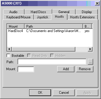 HostFS can support up to 16 mounts and it is very easy to add a new one (which RISC OS sees as another hard disk). To do this simply click on the ... button to open a normal Windows file dialogue box.