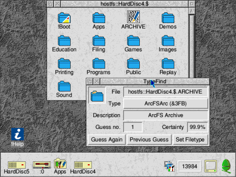 With the files copied you can now load VirtualA5000. When RISC OS has booted you can open the hard disc from the icon bar. You will see your archived files appearing as text files. To restore their file types you need to use the !TypeFind program located in the Filing directory. Load !TypeFind then drag the archives onto the !TypeFind icon on the icon bar. !TypeFind will then work out the correct filetype and a window will open. Click on the Set Filetype button and the filetype will be correctly set. Now all you need to do to open the archive is to double click on it. You can now drag its contents out to de-compress it.