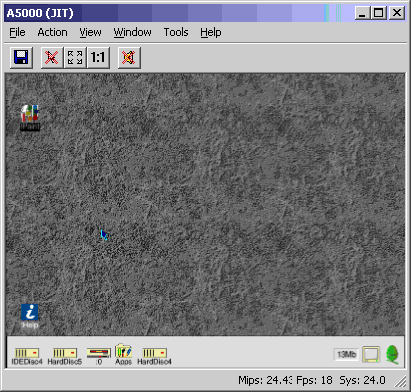 In order to use this new mount you will now need to reset RISC OS. Go to the VirtualA5000 action menu, and click on Hard Reset. When the RISC OS desktop re-appears you will see your new mount as a hard disc on the RISC OS icon bar to the right of the HardDisc4 icon.
