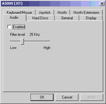 This contains two options. Pause in Background will halt all of RISC OS if the VirtualA5000 window does is not the top window on screen. The top window on a Microsoft Windows PC usually has a blue title bar, other windows have a grey title bar. Note that turning on Pause in Background will stop All RISC OS functions including the clock.