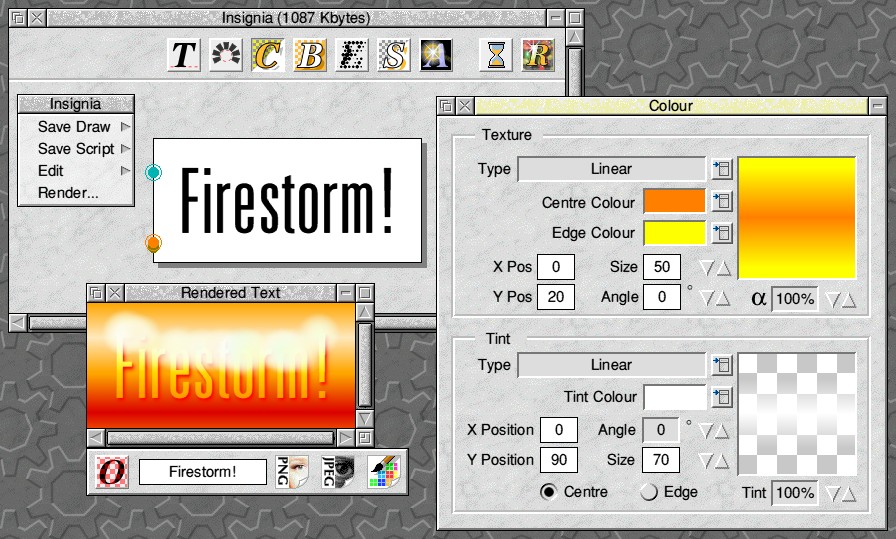 This graphic seemed to lend itself ideally to an animation in which the shape in the centre could remain static but the text surrounding it could rotate. I therefore plotted this graphic 36 times, changing the starting angle of the text by 10° each time, and produced an animated GIF of the resulting frames in the hopes of ending up with a useful logo. Unfortunately the results were not good. Despite the fact that I had used all-capitals, the text was justified slightly differently between the frames, with the result that the circle of words jiggled around unpleasantly as the animation played. Clearly the justification was happening according to the shapes of the plotted letters rather than the circle around which they were being plotted. Now this isn't really a fair criticism of Insignia as such; it wasn't designed to produce animations in this way. But nevertheless, an option to keep the precise position of the conceptual circle (or arc) in the window fixed, rather than relating the output to the actual plotted text, would be a useful addition as it would allow the easy creation of the kind of effect that I was trying to produce. A useful byproduct of the Shape window is the ability to produce Draw files of the letters in the preview window. As you set the various shape options (lines, arcs or stars), the preview updates to match, and you can export the resulting images as Draw files. So if you do want to produce circular text in vector format, you can. Of course, for complex arcs and stars, update of the preview window can become quite slow, but you can at least turn off the Auto Update option. The only surprising drawback of the Arc and Star options is that they do not permit the use of the interpolated text sizes mentioned above; these facilities only work with text in a straight line. The absence of this facility when used with these shapes seems rather inexplicable. Whilst the maths could conceivably get a bit complex with the Arc option, the effect is certainly not impossible to achieve; and as the Star option is no more than multiple copies of the text printed in straight lines at various angles, I can see no excuse for the absence of the text-sizes effect. Indeed, for the star shape, it would have been particularly useful if the text could be made to flare out in size as it extends from the centre to the edge of the star. The inability to apply this effect in these circumstances is an omission which seems both serious and arbitrary. ColoursThe colour of the text can be set to be flat or graded, or text can be filled with a sprite (tiled or scaled). The colours in Insignia all work to the full 24-bit palette, and the RISC OS colour picker window is used for choosing colours. There's not much to say about the use of flat colours except that, of course, one single colour must be used for the entire line of text; you can't set individual colours for the separate letters. You can, however, set the 'alpha level' of the text; 100% is solid, but anything less allows the background to show through.Colours can be graded in the text in a number of ways, though. You set a pair of colours and then choose a fill style to blend between them. You can have a radial fill (you can set the radius), a linear fill from edge to centre and back again (you can set the size of the band and its angle), or a rectangular fill that goes around the edge of the canvas (you can set its width). These options are all fine, but I was disappointed in the case of the radial fill that the fill has to be circular. This seems unreasonably restrictive; after all, lines of text are, by definition, rectangular! A single letter may have a roughly circular bounding box, but in the vast majority of cases, an elliptical fill would be far more useful, and could easily have been implemented if a pair of radii could have been specified rather than just a single radius. Another annoying shortcoming. In combination with the above colour/texture options, you are also able to set a 'tint'. This can be thought of a colour-adjustment highlight which can be applied on top of the basic colour options. Its level can be set as a percentage, with 0% meaning that it's absent and 100% meaning that it swamps (and replaces) the underlying colour. The tint can be flat or can (more usefully) be a linear, rectangular or radial gradation. You can set the tint colour independently of the underlying text colour, and the option is very useful either for adding a highlight, or for adding a third 'colour' to the pair you've defined in your basic colour gradient. BackgroundThe operation of the background colour choice window is absolutely identical to the text colour window just described, with the single exception that there's no 'alpha' setting, because obviously the options deal with the page background itself.You can still have the background as a flat colour, a gradation between two colours or a scaled or tiled sprite, though, and a Tint option is available for the background just as it is for the text. So you might, for example, have linear gradations going horizontally in the background and vertically in the text, with different tint highlights in each, or letters in one tile appearing on top of another tile, for example. The colouring options provided by Insignia are actually very flexible. The absence of an elliptical radial fill is disappointing, but aside from that omission the options are powerful and work well. A few simple examples of colours and tiles follow.