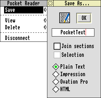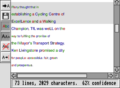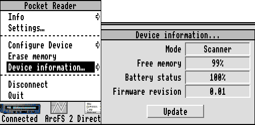 Pocket Reader OCR penHarriet Bazley on the latest gadget from CJE Micros The ingenuity of the Siemens Pocket Reader would appeal to James Bond himself not to speak of the gadget-minded among the rest of us! This is a highly miniaturised scanner little larger than the average fluorescent highlighter pen, specifically designed to recognise and store ordinary printed text for transfer to a personal computer. Back in the 1960s when computers first learned to read the printed word, OCR (Optical Character Recognition) was something that only happened to cheques and machine-readable text required the use of a font so highly stylised as to be all but indecipherable to the merely human eye. ![]() Computer technology has advanced by leaps and bounds since that era, and OCR programs have kept pace; Sleuth, the major RISC OS contender, first came out in 1993 in the days when its PC equivalents cost over 500, and has been under development ever since! But the basic drawback of all such software remains the same the requirement to supply the input text in the form of a large, scanned, sprite. An A4-size flat-bed scanner has never been essential; but it certainly helps, as does having large amounts of spare disc space and RAM in your computer to deal with the resulting images. The idea behind the Pocket Reader, however, is to skip over this stage of the process altogether, transferring letters on the page directly into ASCII codes for the computer. After all, the desired input is text, and the desired output is text why waste space storing high-resolution pictures in order to convert the one to the other? Technical SpecificationsThe Pocket Reader itself is a wedge-shaped, tapering unit approximately the size of a small plastic ruler six inches long by 1.5 inches wide, or 160mm 40mm. It is, however, considerably thicker and heavier, varying from an inch (20mm) in thickness at the back where the battery compartment is stored down to approximately half an inch at the thinnest point. The specification states that it weighs 110 grams including batteries (2 AAA size), about the same as a Walkman or a box of five floppy discs. In other words, its very light compared to almost any other piece of electronic equipment but it is just a little too heavy to carry comfortably in a breast pocket. ![]() The scanner head is housed in the tapered end, along with a rubber roller that is used to detect the start and speed of the scan. Scanning takes place at 400dpi, and the data is read into flash EPROM, thus ensuring that it will be retained even while changing the batteries. The exact size of the pens memory is nowhere stated possibly because in the era of 128Mb RAM requirements it might sound very low? but the oft-quoted figure is 20 pages of A4 text. Frankly, in my experimentations I have never come anywhere near even half-filling the pens memory; I cant see this limit as being a problem for anyone unless they were planning to spend, say, a week taking notes in a university library with no means of downloading them at the end of the day. Apart from anything else, it would take rather a long time to scan in 20 A4 pages line by line. Estimated battery life is at least 20 hours. Every time you switch the Pocket Reader on, exit the configuration menu, or wipe the pens memory remotely via the serial link, a display is flashed up showing the remaining power and free memory. The power level is shown as a sequence of three bars and so far I havent even used up enough power to decrease the rating below full. The pen times out automatically after two minutes, which seems about right. The only times that Ive discovered that it has gone off unexpectedly, I really had put it down and then forgotten I was using it. In any case, since the power has no effect on the data stored, you can simply switch it on again and continue from where you left off. The display is a simple LCD screen that can hold 24 characters, each consisting of a grid of 5 8 pixels higher resolution than a pocket calculator, but lower than the RISC OS system font. On the whole it is perfectly readable, even where accented characters are concerned. Operating the Pocket ReaderThe technique required to operate the pen, while explained clearly in the manual, I found somewhat non-intuitive. Because the leading edge of the Pocket Reader is tapered, it is tempting to hold it at a comfortable angle and rest ones hand on the page, as one would with a pen. However, this technique is almost fatal to producing reliable results.... It is very important to hold the scanner vertically to the paper; I found that it helped to try to think of the device as a highlighter rather than a pen. Those who are accustomed to writing with a Biro rather than a fountain-pen may find this mental leap less essential! The other important factor proved to be a steady hand. If the scanner is allowed to waver up and down as it travels over the line of text, the results will be mediocre at best, and the most likely outcome is for the line lost message to flash up, indicating that the OCR routines could make neither head nor tail of the shapes detected. This is not a serious problem since the line can simply be rescanned provided of course that you notice in time. There is no audible warning, and it is a good idea at least to glance at the display after scanning each line in order to check that all is well. I was impressed by the fact that it appears to cope seamlessly with both serif and sans-serif typefaces, including oblique and emboldened text; even true italics (an separate, almost handwritten serif style, as opposed to the simple slanted text that is oblique) can be read fairly well, although I discovered accidentally that angling the pen slightly in the direction of the slope of the text made an enormous difference here! Unfortunately, it copes very badly indeed with monospaced type, such as printed program listings or the output from StrongED. It does also have a perplexing habit (in any font)