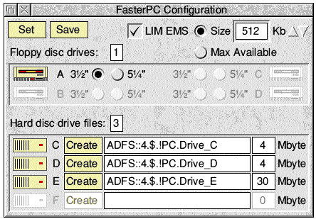 The !FasterPC configuration utility allows the user to define and create the number and size of PC hard disc partitions to be used with the application. It also allows the configuration of the number and type of available floppy disc drives and the presence and amount of expanded memory available to the emulator. !FasterPC was designed to take up the minimum amount of RAM whilst running to allow its use with as many other applications as possible and the configuration and help features of the emulator have been separated from the main application. The reason for this is that the !FasterPC !RunImage has been written in assembler for both speed and compactness. The shared C library and RISC OS libraries added too much of a memory overhead to allow their use to be considered. In addition, the configuration utility, having lots of writable icons, would have been very fiddly to write in pure assembler without a library of RISC OS WIMP routines. For these reasons, the configuration utility has been written in Basic but is only memory resident when you request it. In order to maintain a seamless interface with the main application, the configuration utility does not install itself on the icon bar, but only exists as a window on the desktop. When you have finished with it, close its window and the utility terminates.