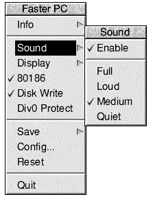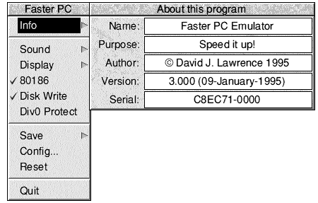 The next option on the icon bar menu is the CPU type. With the 80186 option unticked, !FasterPC emulates an Intel 8086 processor, with the 80186 option ticked, it emulates an Intel 80186 processor. The 80186 has several extra instructions compared to the 8086, and also handles shifts of more than 16 bits in a different way. Surprisingly, some programs require an 80186 or higher processor in order to run. I suggest that you leave this option enabled.
