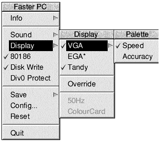 The !FasterPC icon bar menu options can be changed at any time that the emulator is paused and the RISC OS desktop is displayed. The CPU type and sound volume/enable settings come into force the next time that !FasterPC is started, whether by re-entry or re-boot (mouse Select or Adjust). The video adaptor settings are also applied at this point with the difference that if !FasterPC was previously in a video mode that has just been disabled and the emulator is re-entered rather than re-booted, then that video mode will still be in use, although changing to that mode again will result in !FasterPC reporting the error 'Attempt to change to an unsupported video mode detected'. The outcome of this is that you may confuse an application if you disable an 'in-use' adaptor during a run, but the effects should not be too serious.