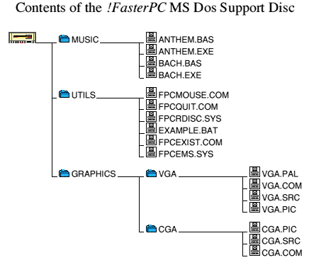 Supplied with the !FasterPC application are the support disc files. These contains several files, utilities, and demonstration programs. The files are described in detail in the following sections and the disc's structure is shown in the diagram below.