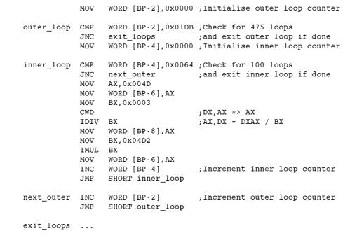 This is taken directly from an actual system performance analysis tool. As you can see, the measurement code consists of two nested loops. The outer causes the inner to be repeated 475 times. The inner repeats 100 times for each outer loop and thus executes 47500 times in all. Each pass of the inner loop consists of some register and memory loading and an integer multiply and divide instruction. These last two instructions are implemented in 8086 microcode but, being a CISC (Complex Instruction Set Computer) processor, they take several clock cycles to execute. In fact, the IDIV instruction can take up to 219 cycles, and on a 4.77MHz 8086, this alone would take 2.18 seconds to perform 47500 times. This compares with around 20 cycles for each of the remaining instructions that are within the inner loop. This shows that the overall performance figure is based mainly on how long these IDIV instructions take to complete. As an efficient divide routine is presented in the ARM assembler manual, it is hardly surprising that Acorn's PC Emulator and !FasterPC produce almost identical performance ratings with such software. The actual rating of 4.2 +/- 0.2 times a 4.77MHz IBM XT when running on a 28Mhz ARM3 is not very relevant, as almost all programs spend their time performing other instructions.
