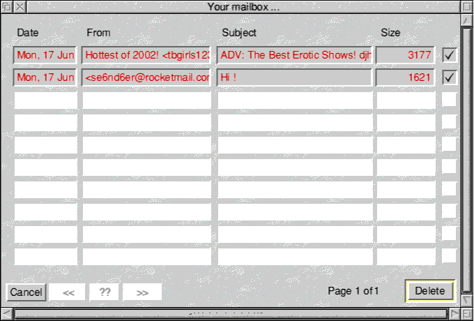 Connect to the internet and when you are connected, click on the Mailscout icon on the iconbar and you should see the following window. ![]() After a while this window should appear and then you can begin the email interrogations! ![]() This shows two bits of spam received which are highlighted for deletion If you want the email, you leave it alone, if not you click on the icon at the end of the email line and give it a tick, it will be highlighted in red now, if you want to add it to the filter click on the "from" with the mouse, you can add "to" and "subject" to the filter (more on that in a bit), when you ready then click on delete to bin the selected emails, once you click on delete thats it - they're gone for ever! When you have decided what emails you want, then click on download email from your internet program and the emails you want not all the rubbish will then get downloaded to your mailbox then come offline and sit back and read your mail! The Mailscout filter is a useful feature of the program, to access them, click menu on the Mailscout icon and select "Show Filters" and window with three textfiles "from" "subject" and "to" should appear if you click on the texfiles you will see any of the email addresses and subjects that you selected to add to the filters, if you get any more emails from the same address or with the same subject then they will be displayed automatically in red but are not deleted until you specify it, so if you remove the tick you can keep the email if you wish to. You can then email all your filtered email addresses to Image Software to create a global filter so all known spam addresses are instantly highlighted for deletion, this list will never be complete as they spammers change email addresses frequently, but it is a very useful feature. Thats basically all there is to Mailscout its a simple but effective little program which does a job that was needed to be done, I absolutely recommend it to anyone who gets spam and gets annoyed with it (that must be everyone) since I bought Mailscout there have been 2 upgrades and there is more to come including the possibilities of being able to read your emails online and check if it is spam or not if unsure some of them are sneaky, also the possibility of being able to drag spam out and dump it into Junkmail to fire off complaints, other features are being looked at so the future looks good for this product, the after sales support and help services from Image Software is superb very quick and very helpful. This review is based on the internet setup of !DialUp with !MessengerPRO with an Argonet ISP, for other set ups contact Image Software, but the most recent upgrade includes a patch to use it with Voyager as well. Product details