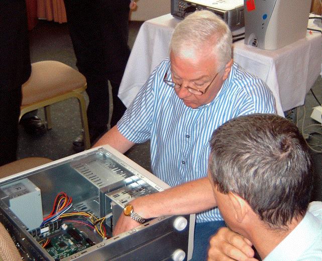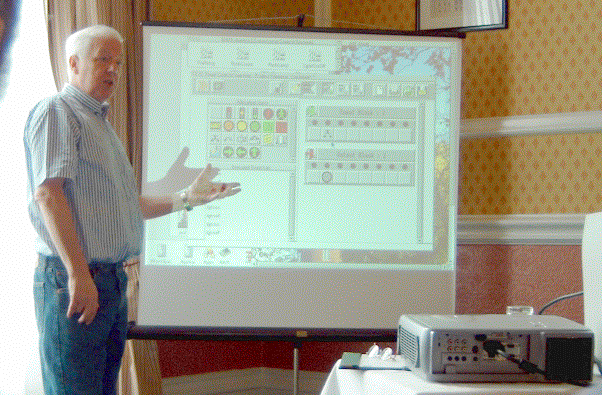 The proposed machine would also come with 2 serial ports, but no PCI expansion slots or Parallel, keyboard or PS2 interfaces. Although this board could power a desktop computer, using a USB keyboard and mouse, this isn't what Microdigital have designed it for. Instead the board is aimed at computer control applications. David was able to demonstrate a prototype control simulation application designed for schools. My personal view is that the board isn't really aimed at schools, but at the more lucrative commercial computer control markets. RISC OS would be ideal for this as it starts very quickly and doesn't need a potentially fragile hard disc to store programs. David Atkins then went on to describe the top of the colour spectrum, the blue machine. This has a spec above that of the current Omega: