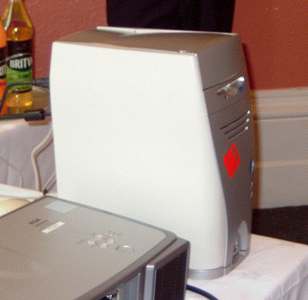 This board has apparently already been designed for a Japanese company that produces medical devices. David Atkins explained that one of the board's first jobs would be to assemble 3D images from 2D slice scans produced by medical scanners. He was also able to confirm that RISC OS would be used as the OS of choice. ![]() The Omega Why is the Omega "Late"David then moved onto to the reason we had really trekked all the way up to Bradford, the Omega. The first question related to why the Omega had been announced at RISC OS 2000, but still hasn't shipped yet. The answer was simple; getting the large FPGA (Field Programmable Gate Array) chips to perform to their published specification. The FPGA chips are the heart of the Omega, as they allow RISC OS to think it's seeing VIDC20 and MEMC chips, as found in the current generations of RISC OS machines. The FPGA chips allow massively increased performance, but look just like Acorn's chip designs to RISC OS. Another advantage of FPGA chips is that they can be reprogrammed easily, even by the customer! Most of the Omega chipset can be reprogrammed with the exception of the SA110, XScale and Southbridge chip. This means that a user of an Omega could simply download a program from the MicroDigital website, which would re-program the hardware and speed up the performance of the computer. For example it is quite likely that the first batch of Omegas will ship without the Lightning Graphics hardware acceleration enabled, the hardware will be on the motherboard, but it won't be activated. Once the drivers have been completed a user will be able to just download the firmware update, run it, and hey presto the hardware acceleration will be turned on. For those that think this sounds a bit fanciful let me assure you it isn't. I recently had to upgrade the firmware in our home DVD player. I simply went to the manufacturers website (www.cyberhome-europe.de) and downloaded a zip file. Then all I had to do was decompress this and write the files to a CD using the PC. Once you pop this writable CD into the DVD player it ran the upgrade program, asked to be restarted and was updated with a new title screen, new menu options and improved DVD playback, all for free! So what is the Omega like?The first question must be is it stable? The answer is yes. An Omega was used for all the presentations throughout the talk given by David Atkins and it didn't show the slightest sign of instability. The prototype on display was in the finished case design, but lacked some of the drivers for the floppy and CD-ROM drives. Also the prototype machine had to be "kick started" from a PC in order to get it to start loading RISC OS. David Atkins did say that all production Omegas would be coming with a free PC to start them up. Then had to explain that this was a joke to a couple of those present. All production machines will come with RISC OS on ROM and will turn on the same as any other RISC OS machine. Once started the normal RISC OS desktop appeared, the whole presentation was done in 1024 x 768 pixels (the maximum resolution of the projector) with 24 bit colour at 80Hz, although the Lighting chip was shown going as high as 1600 x 1200 in 24 bit colour at 75Hz. A wide range of RISC OS software was demonstrated during the talk, including Artworks, Impression Publisher, Easiwriter, TEK 1608 and Vantage. All seem to run very well on the new machine. A few quick speed demos were tried using Draw. Having re-created these on my 287 Mhz StrongARM machine I think the Omega, even with hardware acceleration switched off, still feels 3 times the speed of my old RISC PC. ![]() A bad photo of the Omega desktop The Omega will be shipping with a software bundle consisting of DrawWorks, Ovation and a number of other packages. I was also able to have a quick chat with a couple of developers who are working on Omega specific versions of some of their products, but I can't spill the beans at this point, and I am not allowed to publish the screen shots I have either. The X-Scale and ArmTwisterThe first Omegas will come with the SA110 soldered to the motherboard and a socket for the X-Scale add-on card. This will be available later at a projected price of around £149. Having installed the X-Scale processor a user would then have to run the program to enable the ArmTwister technology that allows both processors to work at the same time. Simply put ArmTwister allows the X-Scale, which is a 32bit only processor, to run a 26 bit operating system (such as current versions of RISC OS) and 26 bit applications with the help of the SA110. David Atkins would not be drawn on how ArmTwister works but one can make a semi educated guess. My assumption, which may be wrong, is that as each block of instructions is fetched into the processors cache it is examined for 26 bit only instructions. If the block does not contain any it is shunted into the X-Scales instruction cache. If it does contain 26 bit code then it is shunted into the SA110 processor cache. Since the SA110 can run both 26 and 32 bit code it does not matter if there is a mixture of 26 and 32 bit code in the same block. This would have a massive advantage over current machines. As more and more code gets converted to 32 bit, more and more will be running on the X-Scale, and the Omega will get faster and faster. Some quick "back of a fag packet calculation" indicated that in a couple of years time an Omega could be running 3 to 4 times its current speed, having only had an X-Scale and some downloads from the website added. So if my impressions are correct and the Omega is already 3 times faster than a RISC PC, in a couple of years it could be 12 times faster! ![]() Looks Like ArmTwister to me! The Omega benefits from a number of other improvements; the hard disc interface will be capable of running at over 40 Mb a second, it can handle over 1 Gb of RAM, it can have a proper PC card added and can take advantage of lost of cheap PCI expansion cards once t