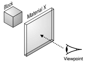 This is the principle of transparencies. The diagram to the right shows an object (Block) viewed through a sheet of Material X from Viewpoint. The link between the operation Shift to colour and Material X is that the percentage opacity of Material X is equivalent to the percentage in Phantasm"s window.