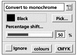 This is identical in layout to Shift to colour and very similar in principle to it. If 100% percentage shift were to be selected with this operation the result would be that all named colours would end up as percentage colours (like tints) of the selected monochrome colour. For example, if 10% Black were to be converted 100% towards Brown (to emulate old photographs), then the result would be that it would alter to 10% Brown. Likewise Black converted in the same way would become the colour Brown.