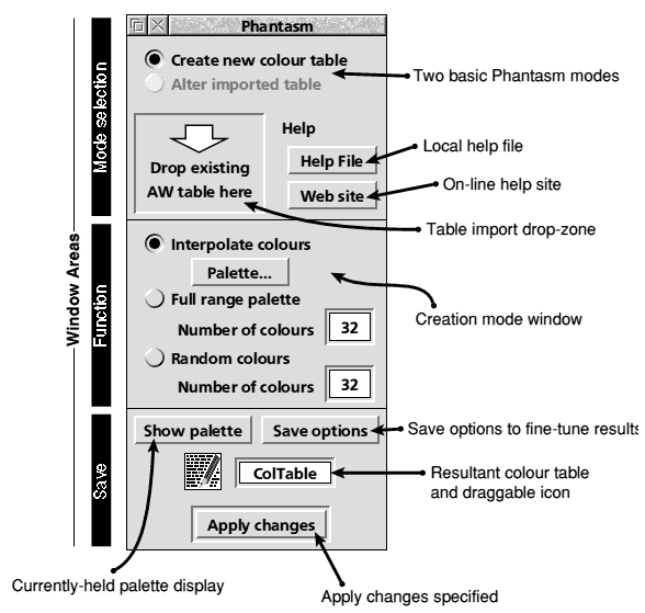 Phantasm can work externally to ArtWorks because it can import and export colour tables from any ArtWorks picture. It was created as a stand-alone application rather than following the conventional module add-on method so that it could provide a large number of options and features that would otherwise not fit within the standard ArtWorks tool bars. An additional advantage is that Phantasm can produce a sequence of colour manipulation operations much faster than any built-in module as ArtWorks does not have to render each stage, only the final result.