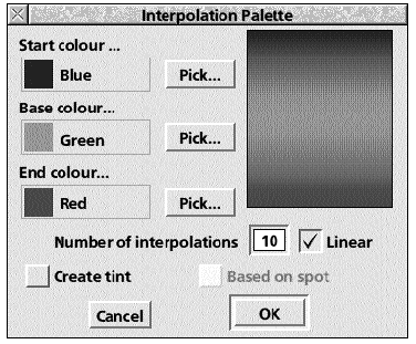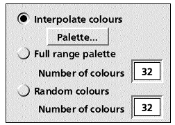 By choosing Interpolate colours (default upon loading) it is possible to generate various types of colour interpolations. The types can be chosen by clicking on the Palette... button which brings up the following window;.