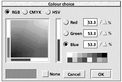 It is possible to obtain more accurate and detailed information by clicking Menu over any of the named colours displayed in the palette window. The type of window that appears depends on the colour type (RGB, CMYK, HSV or Tint).