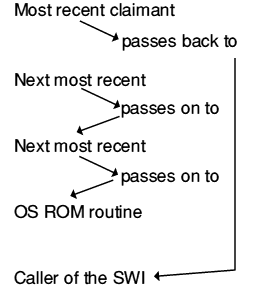 Vectors than be claimed and released by many pieces of software in any order. The last claimant of a vector will be the first to have its routine called, then the next most recent claimant and so on. If any of the claimants intercept a vector then all claimants more recent than this one will have there routines called, but none after this one. See the following examples.