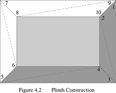 Although there seems to be a lot of code in PROCplinth the method is quite straightforward. If you look at figure 4.2 you will see how the structure is broken up into a rectangle, two lines and eight triangles, two to each side. Referring to the program listing you will see I've managed to pack the triangles in such a way as to keep the number of plotting points to the absolute minimum. The points visited while the triangles are drawn are numbered 1 to 10. Only the first two are move commands, all the rest are PLOT &55. After point 6 has been visited the colour is changed. Colour changes have no effect on plotting positions. It is easy to forget this, and try to make each shape self-contained. This simply wastes time.