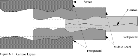 One of the benefits of having scalable sprites is that you can construct pseudo 3D effects in the same way as used in cartoon animation. Although not true 3D the result is quite acceptable and widely used in games. The principle used is based on the fact that the further away an object is the smaller it seems. Typically in a cartoon and most games there will only be four or five distinct layers, referred to as parallax layers. These are usually set out as horizontal strips, the layer furthest away enclosing the horizon line. In figure 6.1 you can see how this fits together.