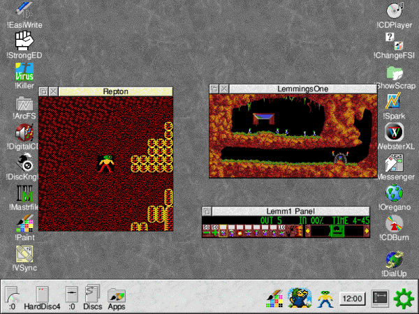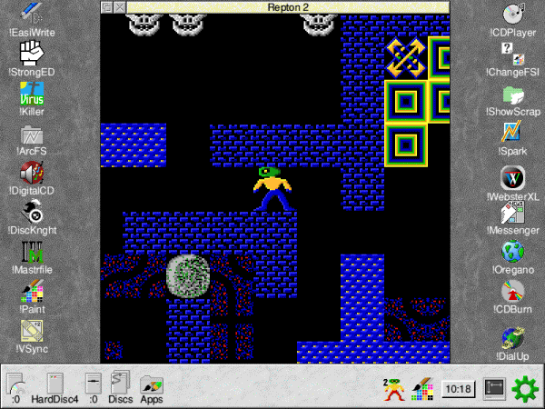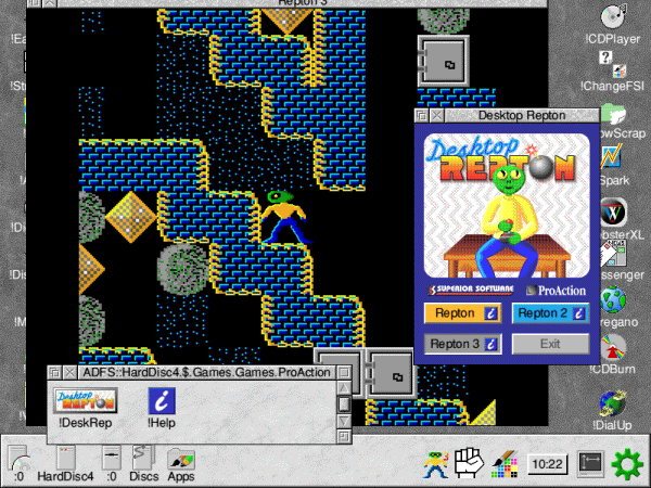 Mat Thompson on the latest Repton Release Repton, what can I possibly say about this game that hasn't already been said? Not a lot probably but I'll have a go anyway! This is a re-release of the recent Desktop Repton which lets you play Repton 3 in the desktop! This new version is based on that, but has a number of new features added, and the traditional CD album case has been replaced with a DVD style box. A quick introduction, for those of you that may not have ever encountered Repton before, the object of the game is to collect all the diamonds on each screen, diamonds can be hidden in safes (key needed) and also in in spirit cages (Repton2 onwards) you can kill the monsters by dropping boulders on them and use the transporters to get to other parts of the screens, (Repton2 onwards) each level has a time limit and when all diamonds are collected (there is a map available to check where they are) you will be given a password to start at that level next time. Upon loading Desktop Repton you are greeted with the following menu. ![]() Choose which game you want to play by clicking on it and it will load into the iconbar, if you should require help click on the little help icon next to the game title. There is an HTML manual supplied with more in depth help for those that need it. If you want to install the game onto your hard-disc then all you do is drag the !DeskRep application to wherever you want it to go and it will copy it across and then it can be run from the hard-disc. With the Repton icon on the iconbar you can click on 'Select' to start the game, or if you click on 'menu' there are a couple of game options - music and sound on and off and you can select either a CGA or VGA display and whether you want to play it in the desktop or normal out of desktop, and whether you want a big desktop window or a small desktop window, make your choices and click select on the Repton icon and away we go. You should now see the main Repton screen, press space to start and its Repton 1 all over again, everything about it is identical from the original release, so if you could complete it once then you should be able to do it over again. ![]() Repton 2 is again (from what I can see) an exact copy of the original, you still have to collect everything with 3 lives which in itself is quite a task, and I've still yet to finish this one so maybe I'll try it again now. ![]() Finally we come to Repton3, which includes not just Repton 3, but Around The World in 40 Screens, Life Of Repton and Repton Thru Time, and of course the game editor you can edit the games screens & graphics using the editor, or create a whole new game. ![]() So there you have it Repton 1, 2, 3, the extra screen levels and an editor, this is the ultimate Repton package! It would be pretty difficult to improve on this version, all the levels and tunes are the same as the originals, and as expected the graphics are improved and run much faster than the originals, try running Repton 1 in small desktop window and you'll see what I mean. My only criticism is that while this is the best version of Repton that has been done, I have (and sure many others) have seen all these screens before so its not that much of a challenge to want to play through them again (particularly the really annoying ones) so I was hoping perhaps some new levels would have been included. There wasn't, but from what I have heard, Superior Software are now re-developing Repton for the PC (and for portable devices such as mobile phones -ED) and that the new levels that it has will be useable with Desktop Repton - so this sounds very promising indeed - anyone fancy converting Repton Infinity? Or how about a desktop Ego? Desktop Repton is highly recommended as you get just about all the Repton games (minus Infinity & Ego) all games work with RISC OS4 & Select 4.32/StrongARM, and with the prospect of new levels makes it hard to refuse - lets hope that it happens) - was it really 17 years ago when all this began? Product details