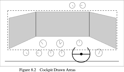 Initially you would define a graphic viewport where the dotted rectangle is and perform the drawing in this area. Then you mask out the unwanted parts with sprites of the dashboard, window framing and overhead area. These sprites would also contain all the fine detail of switches, dials and lights that are not in fact active. Finally you can plot in the small dynamic detail.