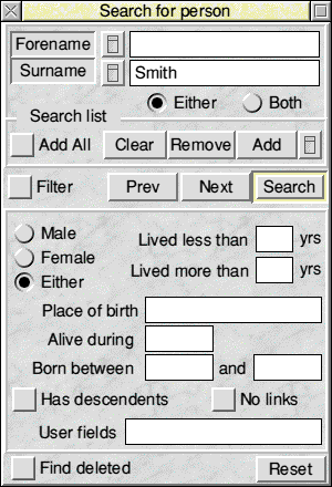Similarly 'Next' and 'Prev' search forward and backwards from the person