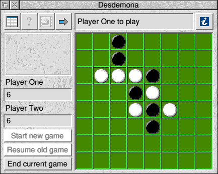 Changing the value after the equals sign (=) will allow you to change the number of lives and smart bombs you initially start with. This game will run on all RISC OS computers from ARM250, RISC OS 3.xx to StrongARM, RISC OS 4.xx. The sound effects are not correct. Other games releasesAs well as looking at new 32bit releases, we have also been looking at a couple of games written in BASIC. Neither of these are new releases bit they are games that I have not encountered before. Since they are written in BASIC these should run on any RISC OS computer including the MicroDigital Omega and the Iyonix. Desdemona![]() The rules of Desdemona are simple. By clicking with Select on any legal square, players must try and fill the board with pieces of their colour. This is achieved by surrounding enemy squares in any one of the eight possible directions. Surrounded pieces convert to the colour of their encirclers'. Good squares to capture include the corners and edges as these are harder to surround. When the board is full the player with most squares of his or her own colour remaining is the winner. Getting Started Install Desdemona on the icon bar by double-clicking the Desdemona icon in the filer window. From the iconbar menu you can find information about the current release of Desdemona, and can quit the application when you're done. Click Select on the icon to open the main window. The configuration of the game is set by the row of buttons along the top of the window. The first button brings up a high-score table of the top five scores recorded. The second button brings up a window from which the Human and Computer player options can be set. Note that you can only set the 'Smart' computer level in the registered version of the game. The final button is used when a game is running, and passes a move when it is impossible to play. The Replay Window The third button is the Replay button, which brings up a window controlling
