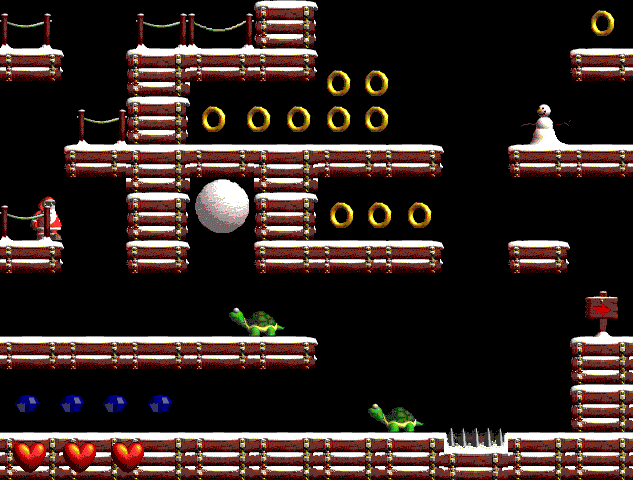 The Game Controls Start new game Resume old game End current game Desdemona requires RISC OS 3.1 (or above) and 96K free to run. This application is Shareware, which means you may not distribute it, modify the code or alter any other part without the permission of the author. To continue to use the application after a short trial period, you must register it by sending £4.00 to the address below. Details can be found on the website. The registered copy has a harder computer opponent and no annoying warning window. Future upgrades to Desdemona, such as extra graphics, better computer players or added features, will be made available to registered users. Constructive criticism, ideas for improvements and general comments are welcome. This file for use with Desdemona version 2.00. © Little Yellow Moon Software 1993-2002. 48 Sycamore Grove SantaCool![]() I must say that I am rather impressed with the graphics on this game, although its not a full finished game, in fact its more of a "technology demo" it is very playable, and not as easy as it looks either. The author is Andy Spence so he can tell us more. "This is a demo pre-release of what is to become a public domain, bit-map platformer. The aim of this release is to see if their is enough interest in it to see the project through to the end. Because my coding is so bad, I would advise that this games only runs at a playable speed on a SA RiscPC. However if it runs too slow on your computer and you are /that/ desperate you can always go to the level data at the end of the !RunImage file, and reduce the 'delay' variable to increase the speed. It is usually set to "delay=2". The Idea You play Santa, who happens to be wearing an incredibly expensive pair of 'Ray-Bans' which makes him cool,... apparently. Avoid all hazards, moving and static. Collect all the bonuses on each level before following the arrowed sign to the next level. Throw the switches to reveal and open hidden doors to finish the level.