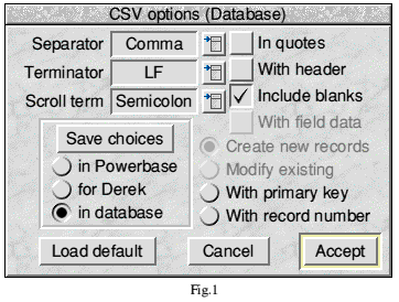 This information enables you to add a header of the above type to a CSV file which doesn't have one - perhaps a file from a non-RISC OS source - and thereby use it to make a Powerbase database. If the origin of the file is unknown you'll have to examine it carefully to decide the maximum field lengths. It pays to be generous. If you don't allocate enough space any data which won't fit is saved in a file in PrintJobs called TooBig. The actual length of the overlong data is shown in brackets for each entry in this file. It isn't essential to specify the field-type or the descriptor. If the field-type is omitted it defaults to 0 (Unrestricted) and if the descriptor is omitted it becomes the same as the tag. A minimum field-specification, therefore, consists of a number (the length) and the tag, e.g. 15|NAME.