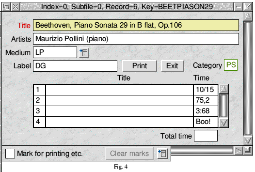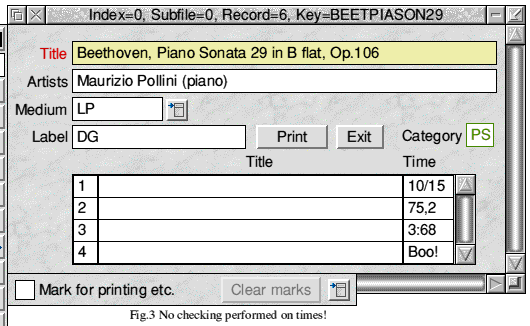 This database is on the CD in the zip file MUSIC. If you experiment with the last column of the scrollable list field you will find that no checking is performed to ensure that what you enter is a valid time in minutes and seconds and whatever character you enter to separate minutes from seconds remains unchanged when you type Return. Fig.3 illustrates this lack of validation and reformatting: