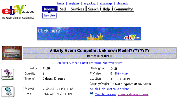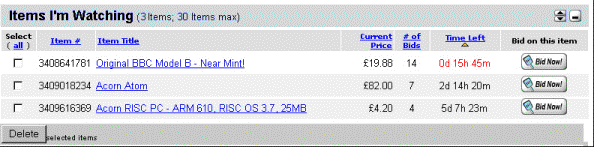 The screenshot above shows an example of three items being watched and shows the current price and time remaining among other information. If you no longer wish to watch an item you can select a tick box at the left hand side and click the "Delete" button to remove the item(s) selected. Another use of watching is that items will remain listed even after bidding has finished enabling you to see what the final price was when the item is no longer listed on the "normal" pages. By the way don't take too much notice of the fact that the Acorn Atom is fetching 20 times the amount the Risc PC is fetching as prices often change dramatically as the auction ends.