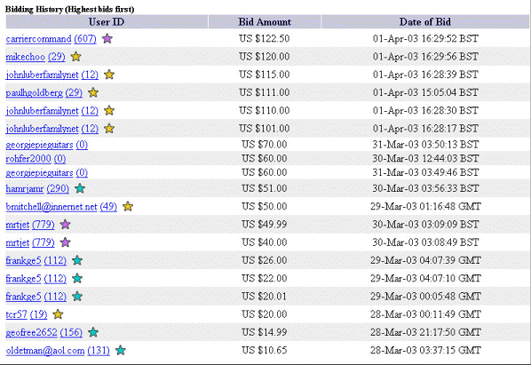 Look at the example above. The second place bidder "mikechoo" (me) has a bid timed at 4 seconds after the winning bidder even though later bids are not recorded if less than an existing one. Clearly what happened here is that "carrier command" entered a bid to outbid "johnluberfamilynet" and that maximum bid was at least $122.50, maybe more, and was timed 4 seconds before my bid. As "johnluberfamilynet" had bid $115 the "carrier command" bid would exceed that and the price would be $117.50 (as bid increments are $2.50 over $100 I think). My bid would have outbid the current price and so is recorded as a bid but as "carriercommand" put in a maximum bid of at least $122.50 their bid automatically jumped to exceed mine even though it was lodged earlier. Get it? Notice 3 bidders all bidding in the last minute and a half of time left.