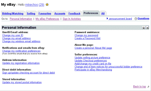 Here you can change a whole range of personal information as you can see in the screenshot. There are also further sets of options for "eBay preferences" and how you sign in.