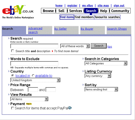The earlier article on buying through eBay covered simple searching using the "Browse" option. This is very simple and quick to use and may be quite satisfactory for many purposes. However, it may be that you want to be able to carry out a more detailed search, for example one that will filter out unwanted items that might be included in a simple search. If you searched on "Acorn" for instance you would get any items that contain the word "Acorn" in the title irrespective of whether they had anything to do with Acorn computers.