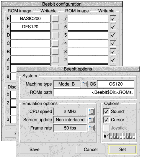 If you don't own a BBC Computer, but do have a copy of Acorn's '65Host' you can use the accompanying program 'RipROMs' to extract the ROM images. You will have to extract BeebIt to a writable disc and open the filer window that contains !65Host before you do this. The ROMs can be called anything you like as long as the file name matches what is on the configuration screen. I recommend naming your ROM files with the first part describing what the ROM is, and the second part what version it is. ie. OS120 is BBC B OS 1.20, OS200 is BBC B+ OS 2.00 and DFS120 is Acorn DFS 1.20. ![]() The BeebIT configure windows BBCFiles - James LampardThis is an essential add on for BeebIT and allows you to easily convert filetypes between different BBC emulators on both RISC OS and Windows. Formats supported include: