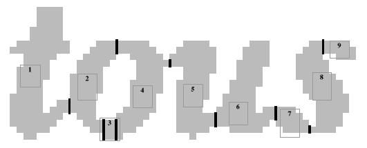 The pieces in this shape would probably be combined so that 1 was on its own as a 't', 2 and 3 would be combined to make a reasonable 'c', then 4 would be added to make the 'o', 4 and 5 could make an italic 'n', 5 and 6 both make bad i's, but together make a good 'u', it is possible that 6, 7 and 8 could make a bad 'w', but that would be discarded for 7, 8 and 9 to be combined to make the 's'.