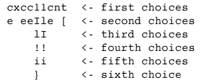 A shortlist of possibilities is obtained for each shape in the line and the best recognised letters used to find the baseline and scale of the text and so remove letters from the shortlists if they have the wrong size or position. Next word breaks are found and each word is visited in turn. If letters can be chosen from the shortlists so the word spellchecks without any letters being poorly recognised the word is done. Here's how the word "excellent" from a low quality scan might look like at this stage. There are no split or joined letters, but the correct interpretation is far from obvious.