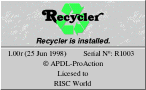 Just copy the !Recycler application to wherever on your hard disc you wish to install it, but see the following section if you want Recycler to be run automatically when you start your machine.
