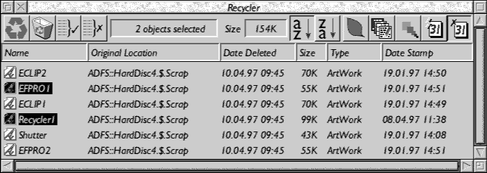 Click SELECT on this and the currently selected files will be returned to the location from which they were originally deleted. If they cannot be put back for some reason, e.g. not enough disc space, then they will be left in Recycler.
