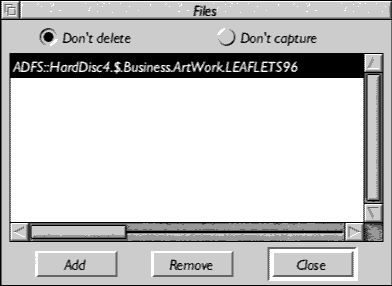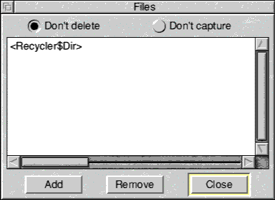 To exclude a file from capture by Recycler select the Don't Capture option at the top of the Files window and click select on the Add option to open the window below.