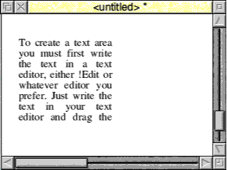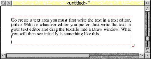 To create a text area you must first write the text in a text editor, either !Edit or whatever editor you prefer. Just write the text in your text editor and drag the textfile into a !Draw window, making sure that you press RETURN at the end so that the text ends with an end-of-line character, otherwise !Draw will give an error message and won't load the text.