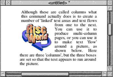 Although these are called columns what this command actually does is to create a number of 'linked' text areas and text flows from one to the next. You can use it to produce multi-column pages, or you can use it to make text 'flow' around a picture, as shown below. Here there are three 'columns', but the three boxes are set so that the text appears to run around the picture.