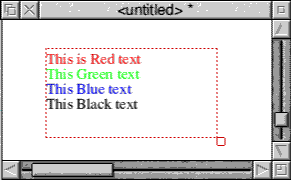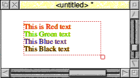You will notice that there is no Rotate handle on a text area object. This is one of the things you can't do with text areas. If you select the text area and then look at the Style sub menu you will see that the only items that can be selected are 'Text colour' and 'Background', and although the former works as expected the latter doesn't, but more about this later. You will also find that although text areas can be magnified, this merely alters the size of the frame the text appears in, it doesn't alter the width or height of the actual text. Unlike simple text objects you cannot alter the font or size of the text from the Style sub menu, these and many other features are all set and altered by commands embedded in the text. It is these embedded commands that are the most powerful feature of the text area.